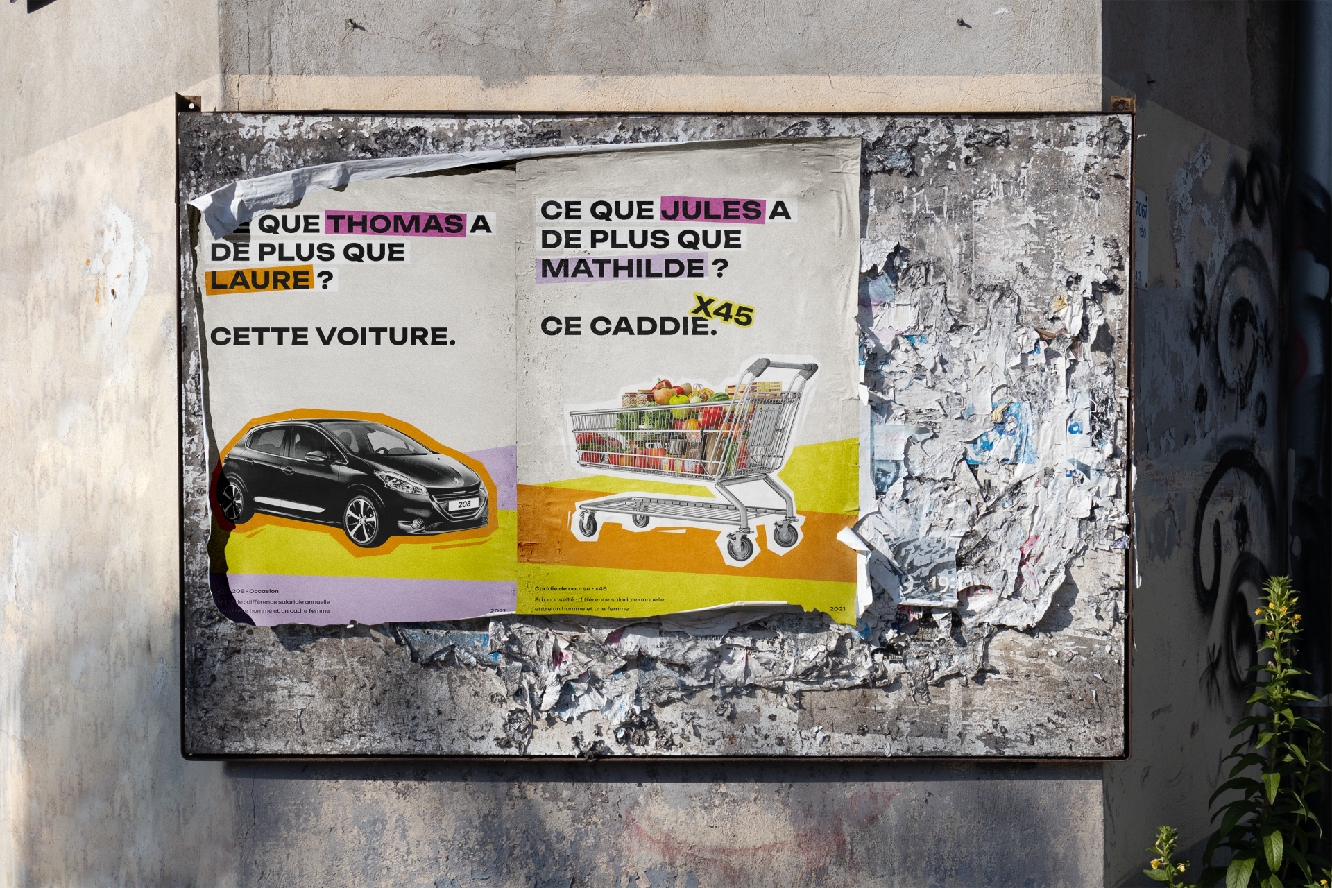 Description : J’ai réalisé une série de trois affiches pour visualiser les données sur l’inégalité salariale entre hommes et femmes. Chaque affiche traite d’une catégorie spécifique : l’inégalité parmi les cadres, l’inégalité parmi les employés, et l’inégalité de manière globale, tous secteurs confondus. En transformant ces données en infographies à la façon d’une publicité, avec des couleurs vives, j’ai cherché à attirer le regard des gens afin de sensibiliser et d’informer le public sur cette problématique sociétale.