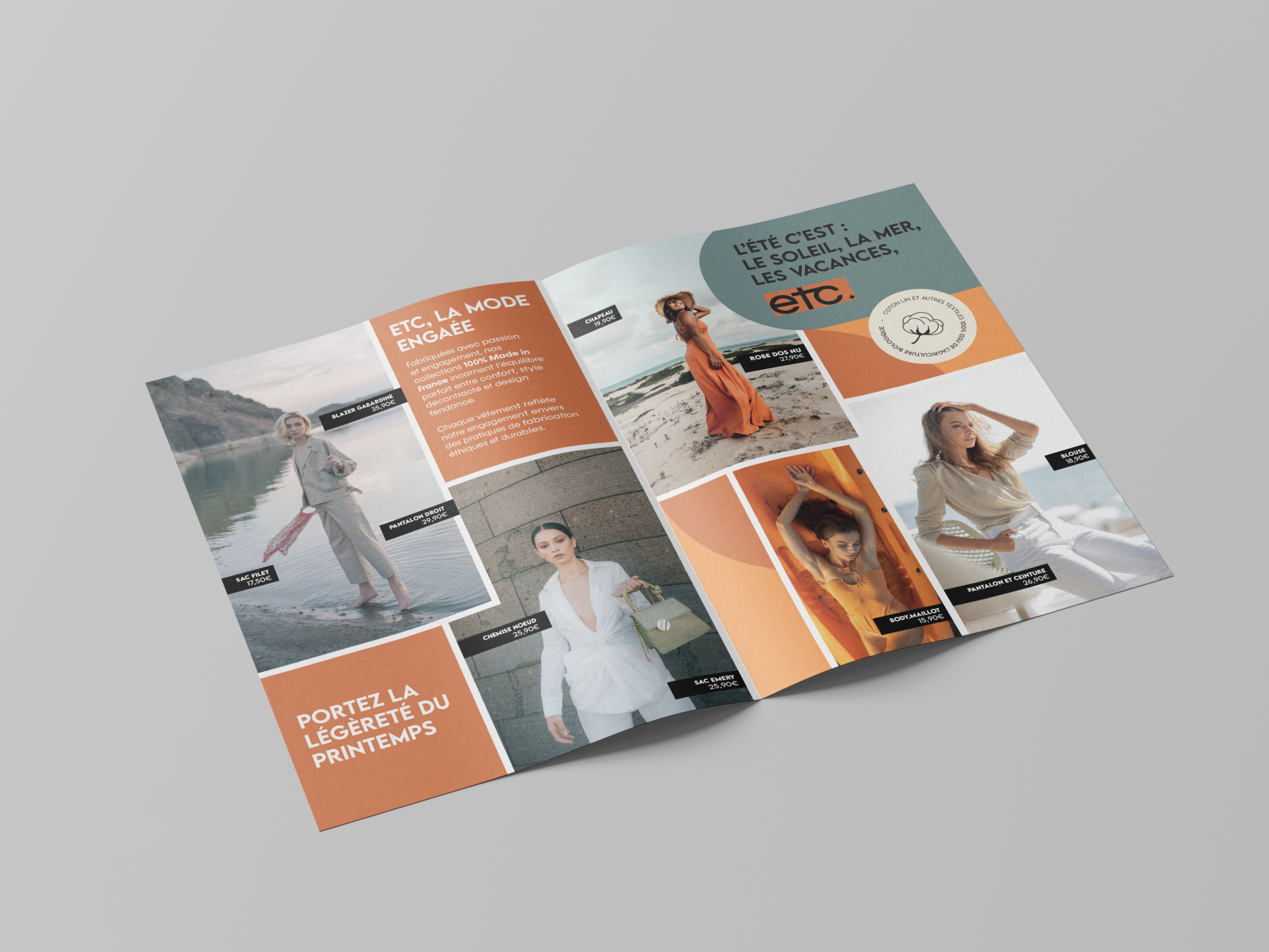 Description : J’ai créé un leaflet pour la collection printemps-été de « ETC », une marque française (fictive) de mode éthique. La direction artistique s’inspire d’un mélange entre le Bauhaus et le vintage, avec une palette de couleurs dominée par le bleu et l’orange. L’objectif était de capturer l’esthétique à la fois moderne et rétro, reflétant l’engagement de la marque pour une mode éthique et durable.