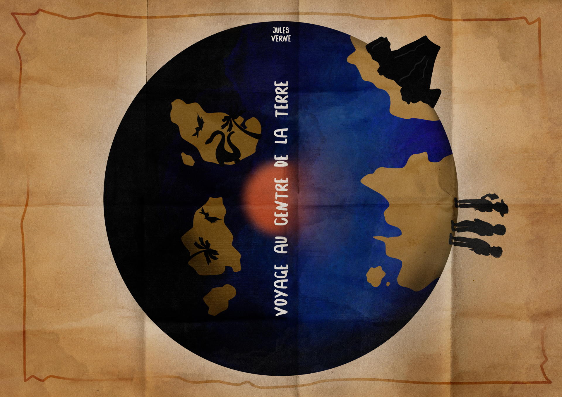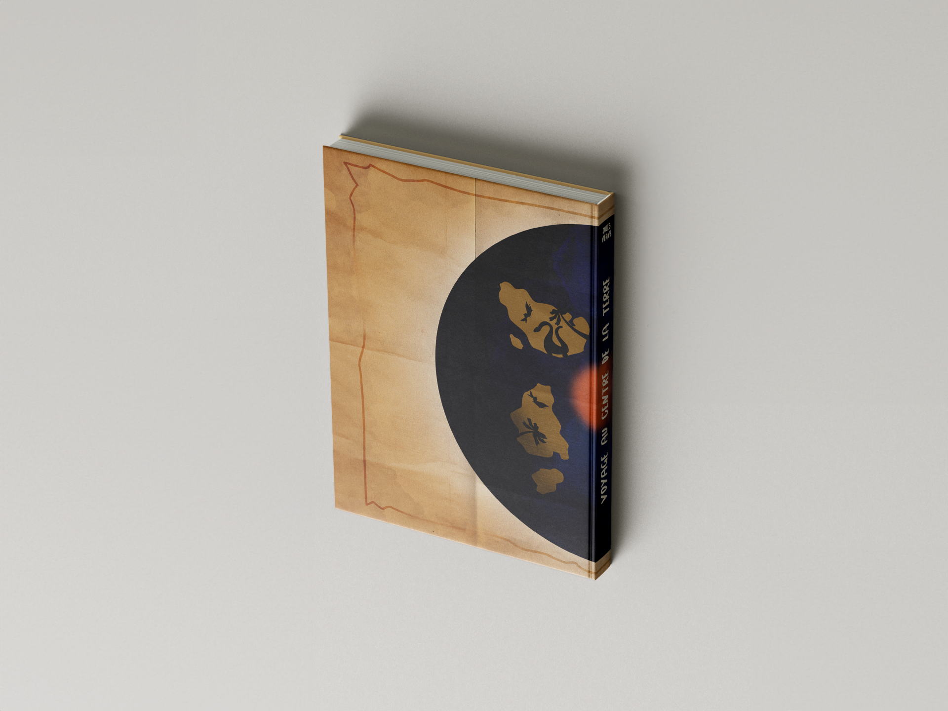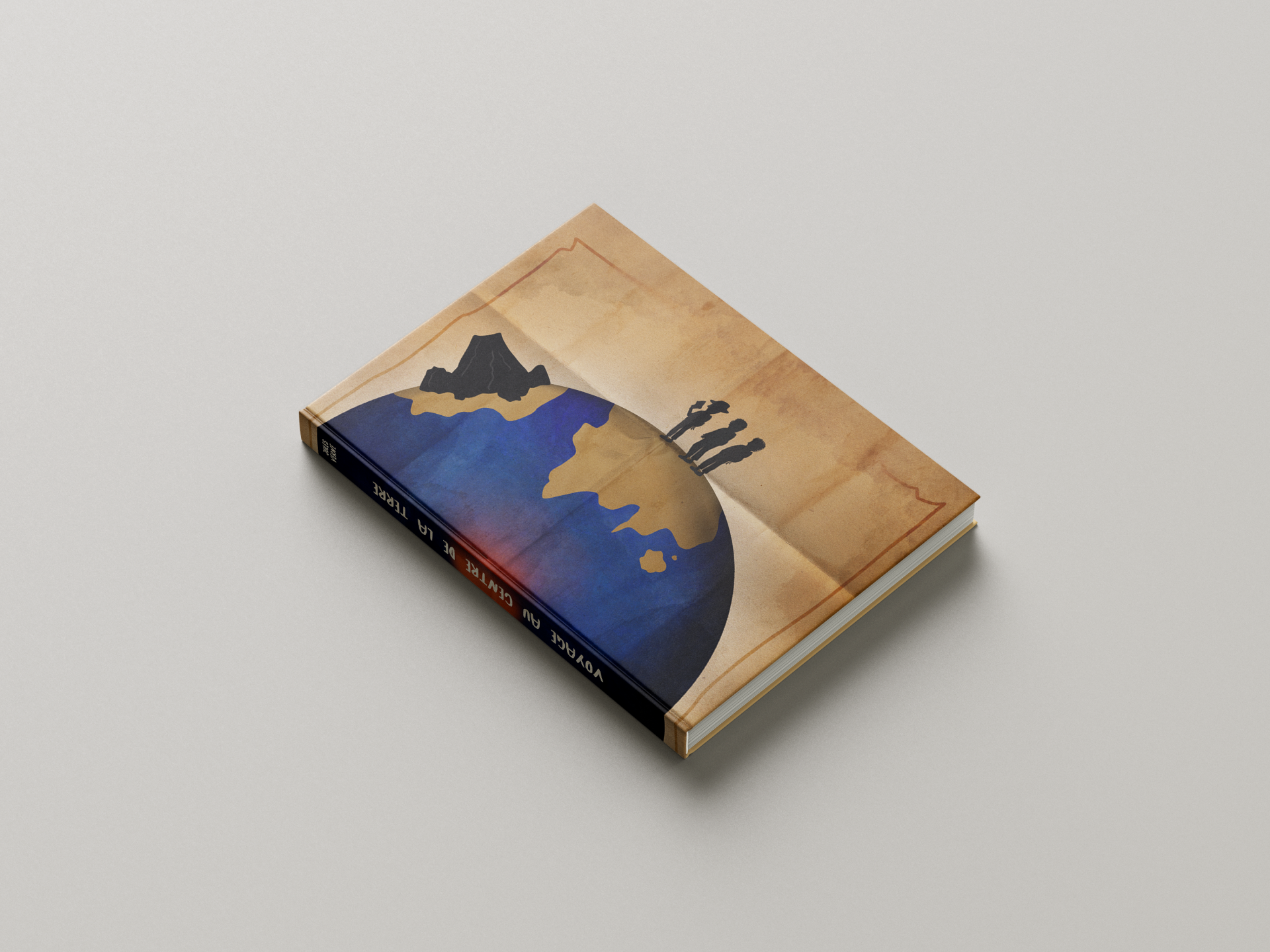 Description : J’ai illustré la couverture du livre « Voyage au centre de la Terre » en respectant la contrainte de n’inclure aucun texte, à l’exception de la cote du livre. J’ai utilisé l’intégralité de la couverture pour créer une illustration représentant la séparation de la terre en deux, symbolisant la division entre la surface et le centre. Mon objectif était de créer une image intrigante reflétant l’aventure et l’exploration.